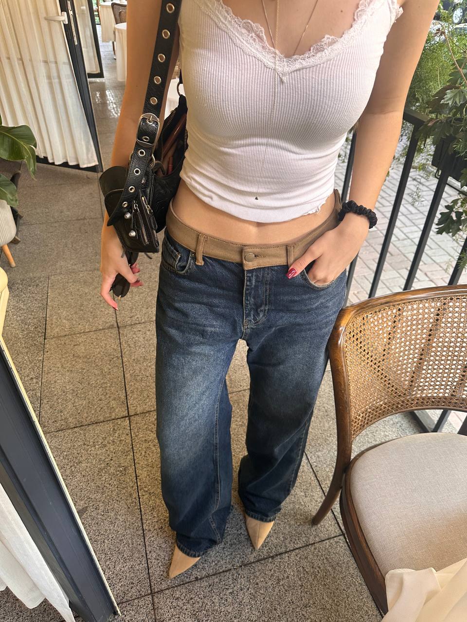 Джинси прямого вільного крою, з середнью посадкою. Виконані з якісного плотного деніму і мають акцентний пояс з коричневого замшу.