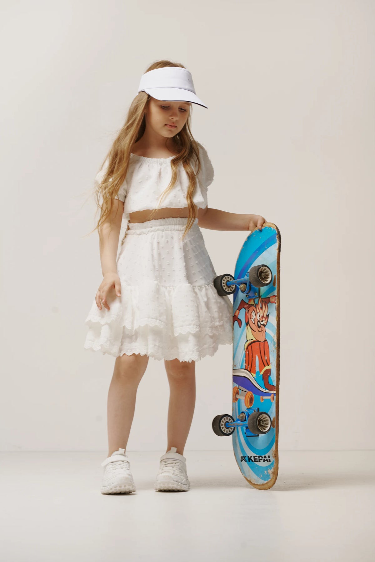 Summer suit for girls made of soft fabric — festive and comfortable: top and skirt with scalloped edges and embroidered elements.