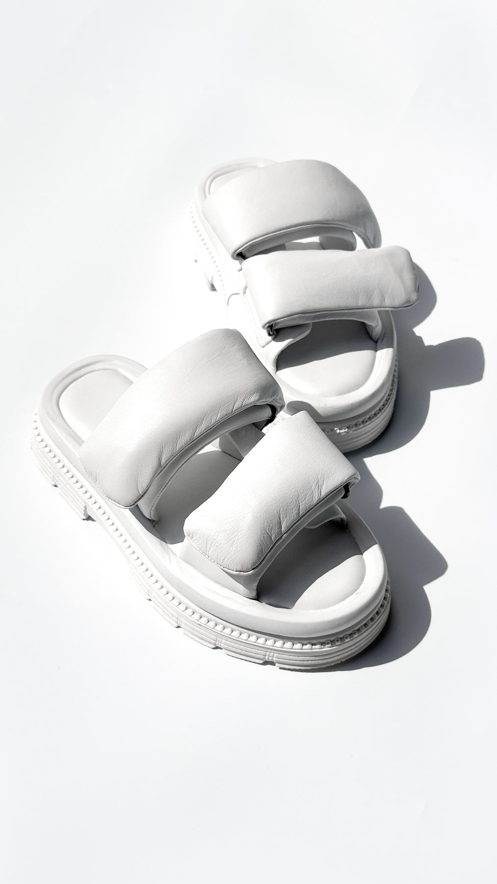 Comfortable flip-flops made of genuine leather — stylish voluminous shape, adjustable straps with Velcro fasteners, and shock-absorbing insoles. 4.5 cm wedge heel. Full-size model.