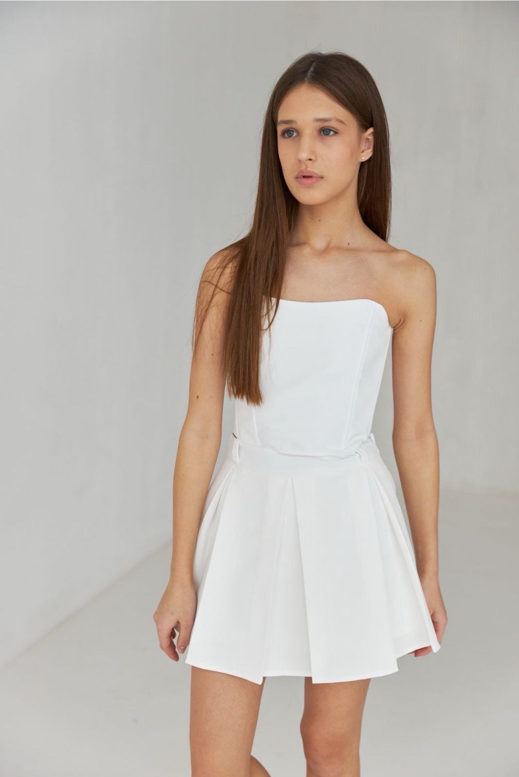Костюм в сучасному дизайні, виконаний з якісної тканини, яка гарно тримає форму. Спідниця з вшитими шортами, корсет на кісточках, має шнурівку.