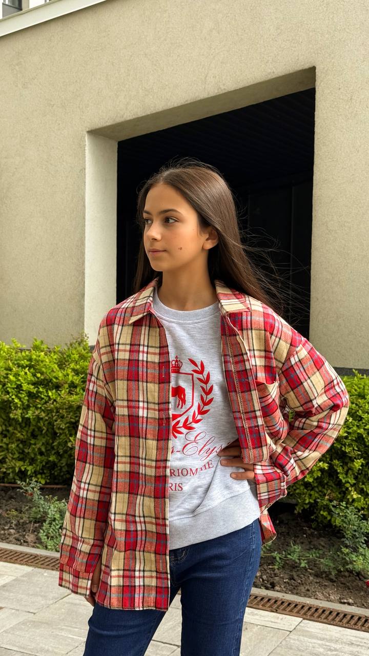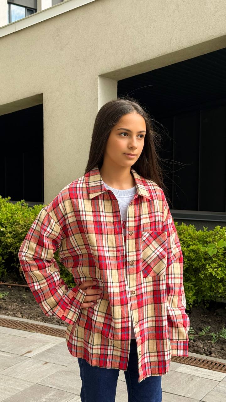 Картата сорочка для дівчинки – оверсайз крій, 100% бавовняна байка, застібка на ґудзиках. Ідеальний варіант для школи та прогулянок