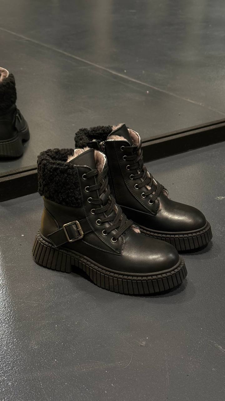 Gli stivali sono realizzati in vera pelle verniciata, hanno una cerniera e lacci per garantire comfort e regolazione della larghezza. Il modello è imbottito con vera pelle di montone per resistere a temperature fino a -25 °C.