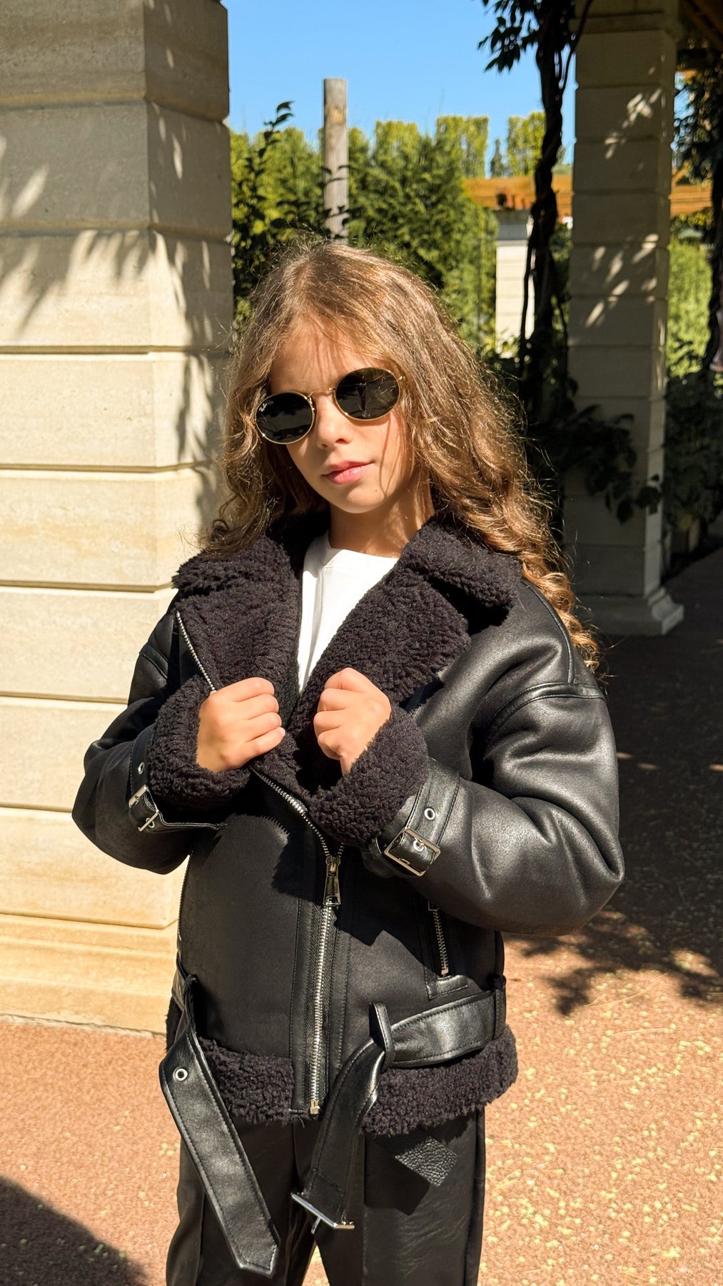 Куртка-авіатор для дівчинки Стильна куртка моделі авіатор, виконана з якісної еко-матеріалів з імітацією натуральної шкіри та хутра. Оснащена зручним поясом для регулювання посадки та застібається на блискавку. Тепла, практична й ультрамодна — стане акцентом будь-якого осінньо образу.