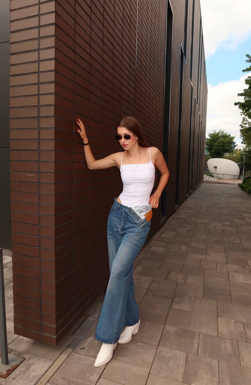 Джинси з якісного деніму з крутою фішкою - асиметричний пояс. Модель має гарну посадку, підходить на зріст для неисоких дівчат до 165см.