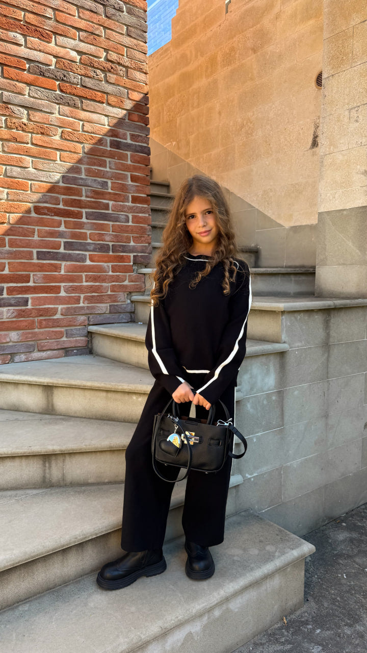 Стильний костюм, виготовлений із м’якої віскози, оздоблений лампасами. Светр класичного крою поєднується з прямими брюками. Брюки мають комфортний пояс на резинці, завдяки чому костюм не тільки трендовий, але й дуже зручний у носінні.