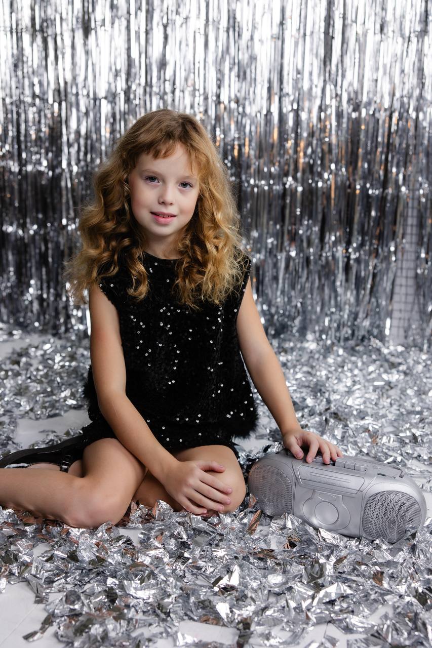 Святковий костюм, декорований паєтками. Складається з спідниці та короткого топа, що по низу оздоблені пір'ям. Модель маломірна на 1,5 розміри.