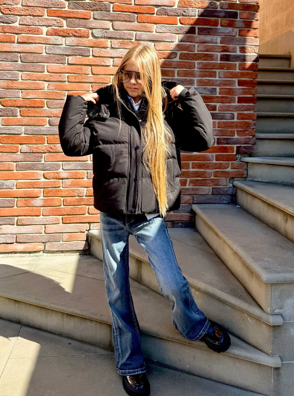 Укорочений пуховик з водовідштовхувальної матової плащівки, утеплений тінсулейтом. Усередині — підкладка з еко-хутра, що дарує максимальний комфорт у холодну погоду. Модель має зйомний капюшон із пишною опушкою, застібається на блискавку та кнопки, а також оснащена утяжкою по низу для ідеальної посадки.