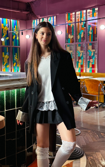 Women's oversized jacket with lace on the sleeves — a stylish combination of classic and romantic styles. The double-breasted masculine cut is perfect for both office and smart-casual looks. Decorative lace adds sophistication and draws attention to the details. Created for those who appreciate comfort and elegance in one look.