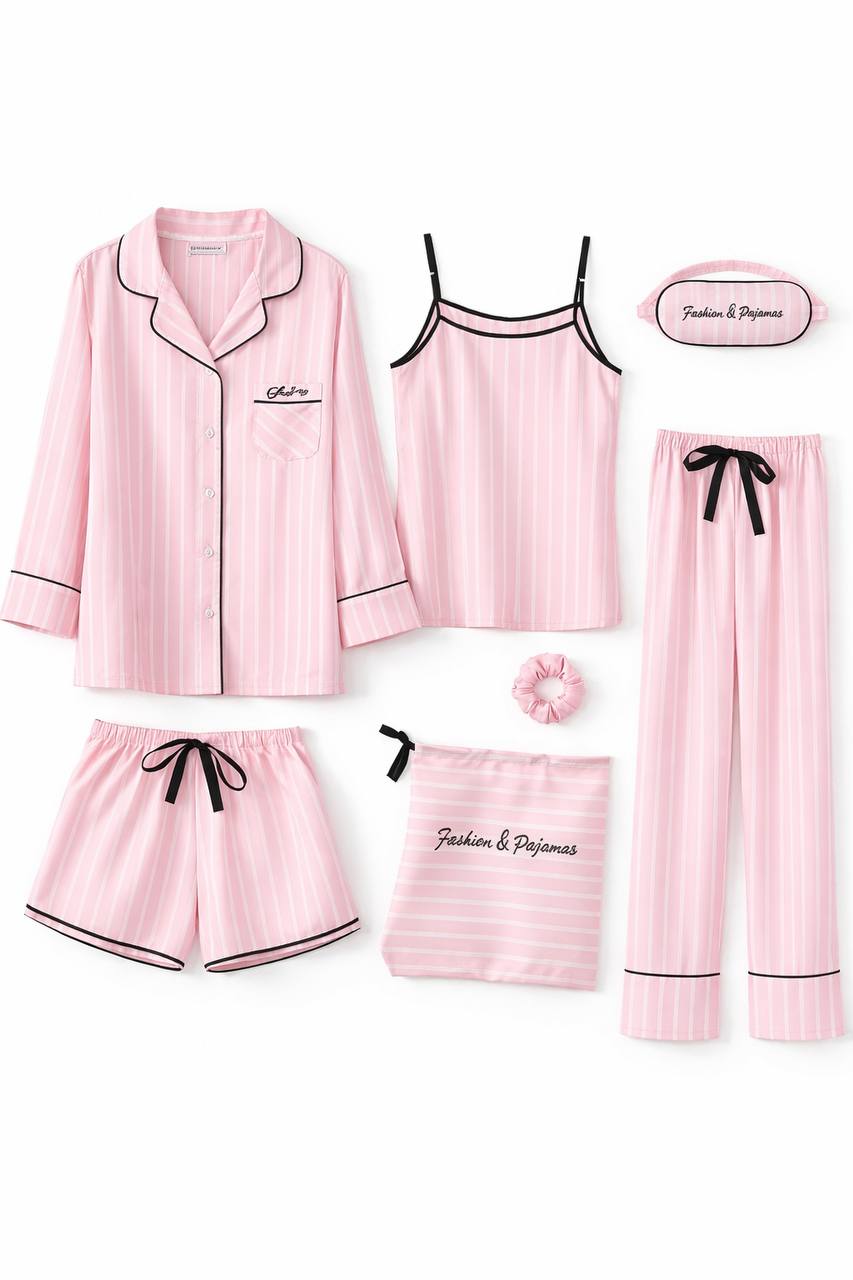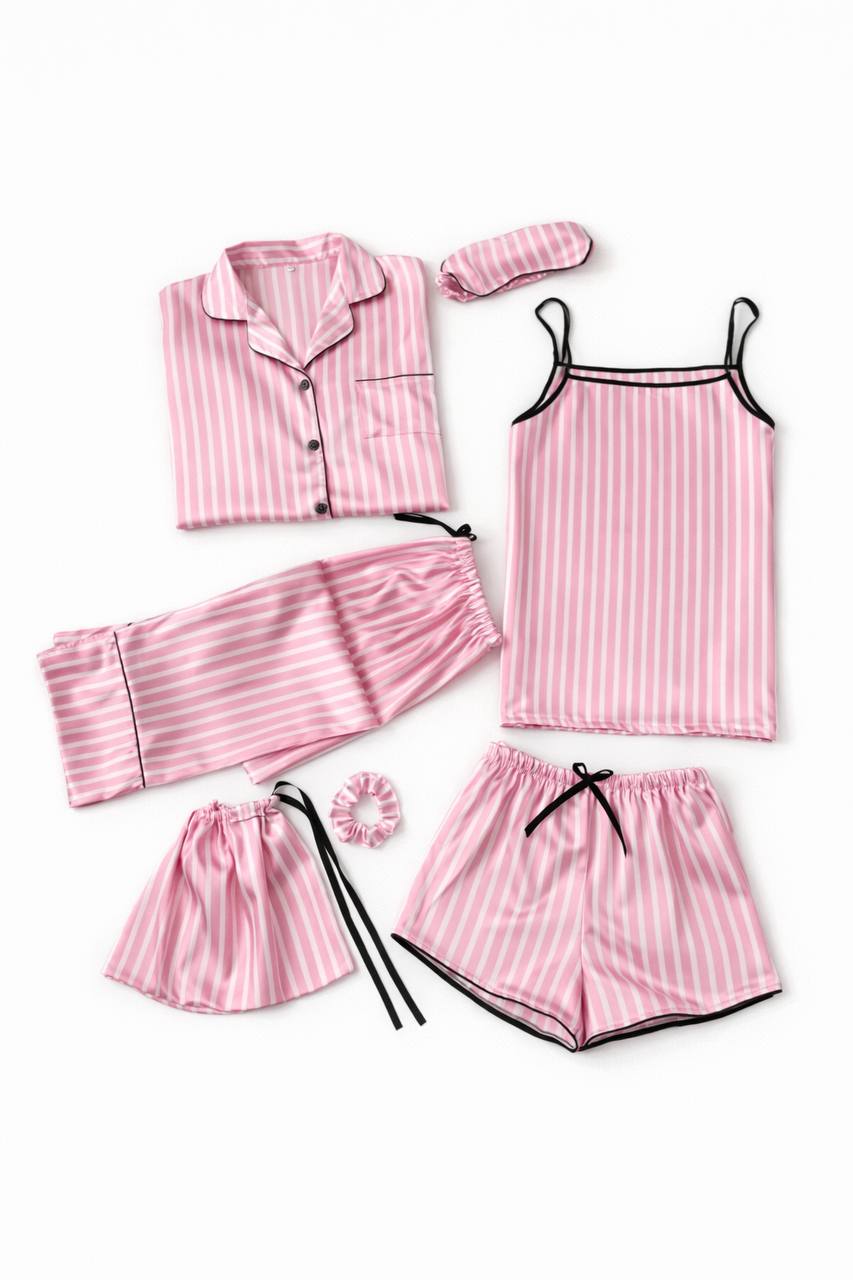 Піжамний комплект, що складається з сорочки на гудзиках, штанів, шортів, топу на бретелях, резиночки, маски для сну та мішечку для зберігання. На моделі розмір 160 на зріст 154см