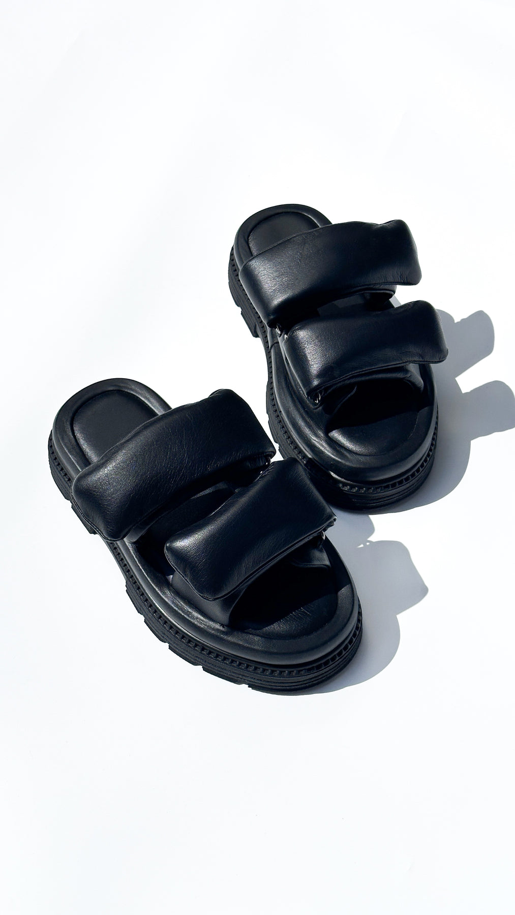 Comfortable flip-flops made of genuine leather — stylish voluminous shape, adjustable straps with Velcro fasteners, and shock-absorbing insole. 4.5 cm wedge heel. Full-size model.